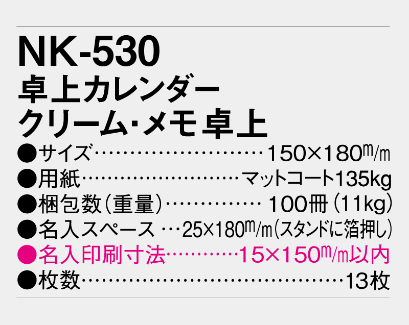 2026年 NK-530 卓上カレンダー クリーム・メモ卓上 【卓上カレンダー】【名入れ印刷 無印50部から】